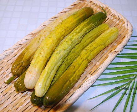 실온에서 약 2일간 두어 오이가 숨이 죽도록 합니다. 2일 후 오이의 위치를 위아래로 바꾸어 주고 다시 눌러줍니다. 다시 2~3일간 실온에서 숙성합니다. 오이가 노르스름하게 변하면 숙성이 완료된 것입니다.